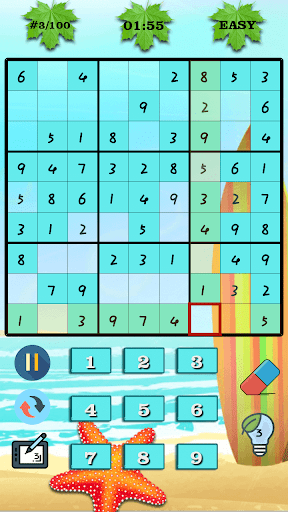 The goal of Beach Sudoku is to fill in a 9×9 grid with digits so that each column, row, and 3×3 section contain the numbers between 1 to 9. At the beginning of the game, the 9×9 grid will have some of the squares filled in. Your job is to use logic to fill in the missing digits and complete the grid. Don’t forget, a move is incorrect if: