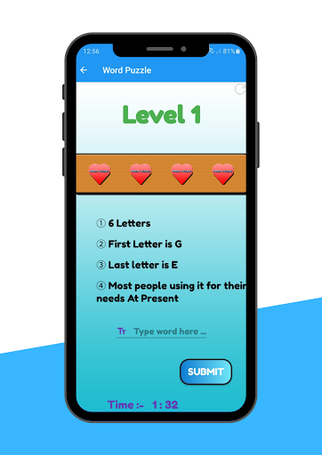 There are some hints for one hidden word. You need to find the correct word using these hints. If you found the correct word and you can win the game with in 3 chances. There are 35 levels in this mode.