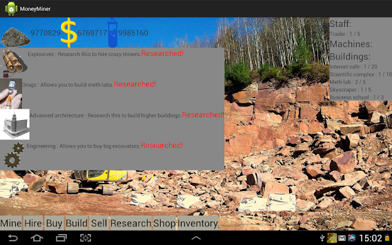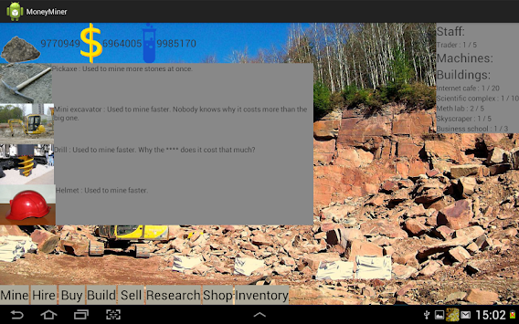 Mine to the top! Hire staff, construct buildings,buy vehicles and stuff to mine faster, research new technologies!