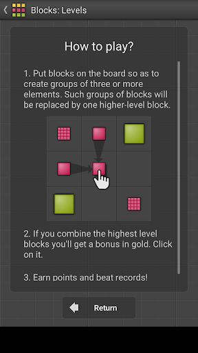 - Basic principle of this brain game is simple: Put blocks on the board so as to create groups of the same color, shape and size.