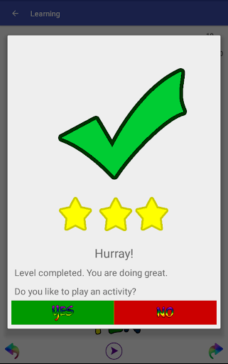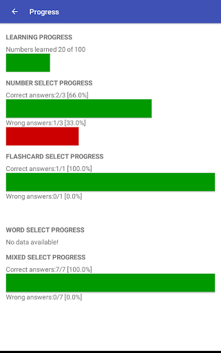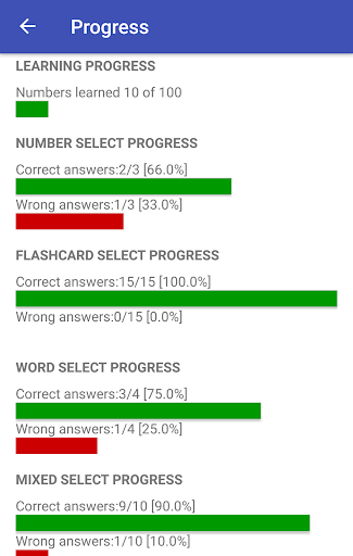 Parents can have a look at the progress of the kid on learning and playing activities. It will show how much numbers the kid learned (out of 100) and correct/ wrong ratio of the activities he/she played.