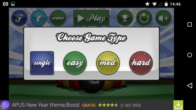 Grand Billiard is a single player game can be played against 4 modes: one is against time (single player) and rest three is against computer in three difficulty levels like easy, medium, and hard. It has provision of different achievements, which are like: