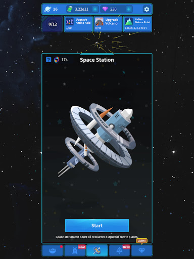 This is a simulation and strategy game with the theme of space construction. Your spaceship arrives in a galaxy, but all planets here are destroyed because of an explosion. Your main mission is to re-construct home for the aliens on the ruins/cores. To build planets, you need to collect matters, unlock environments and seek microbiology. The more resources you collect and level up, the more planets will be constructed. There is no doubt that the aliens will help you to build the planets together. You can also accelerate the speed of construction with the help of space station. Do not forget to explore with a spaceship to get more fuels for the space station!