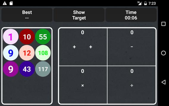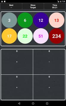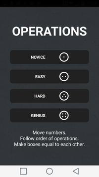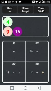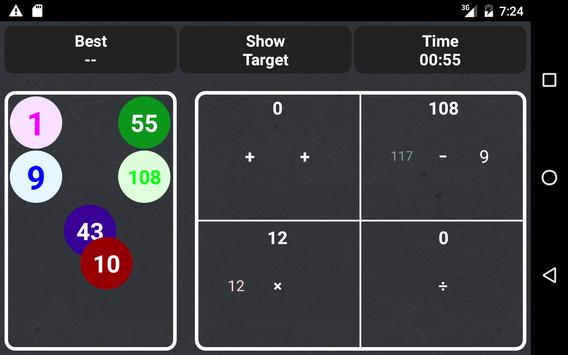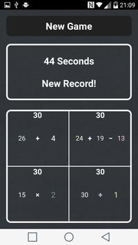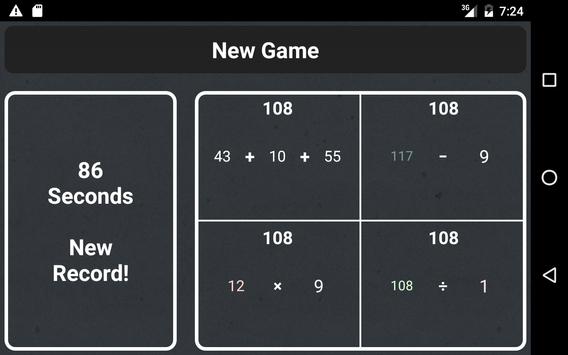 You are presented four boxes, each containing a mathematical operation, or operations, to which you add one of the provided numbers. Your objective is to use all of the numbers to make the boxes equal to each other in as little time as possible.
