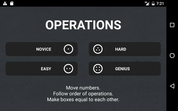 Novice uses each of the basic operations, and each progressive level adds in compounded operations, and Genius adds parentheses.