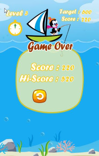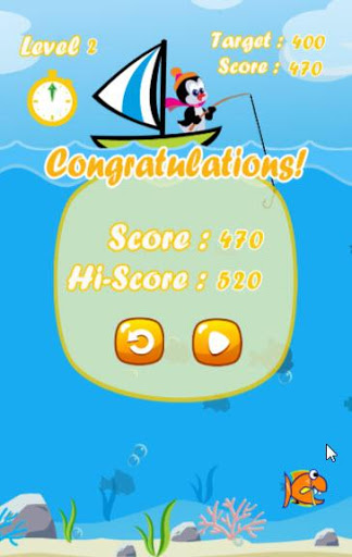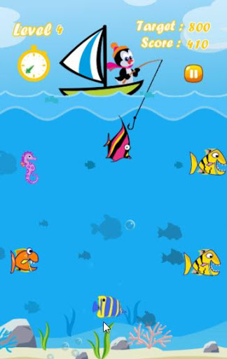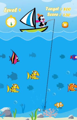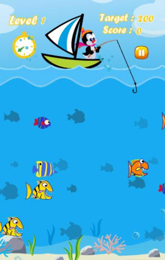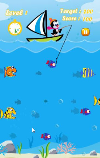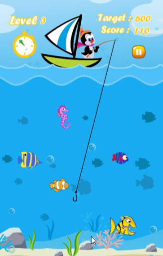We must help the penguin to catch as many fish for a limited time in each level. Each type of fish give a different score when it is caught. If the penguin can score greater than the target, you can pass to next level. There are new fish species when you go to the new level such as colorful fish, fierce fish, clownfish (anemonefish), squid, shark, dolphin and others. It’s very easy to play this fun fishing game. Just tap on the screen at your target point, then the penguin casts the hook to your touched point. Wait for the best timing, cast fishing rod and hook. You’ll be the best fisherman surely.