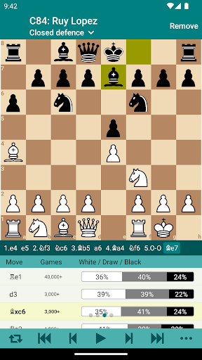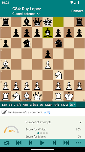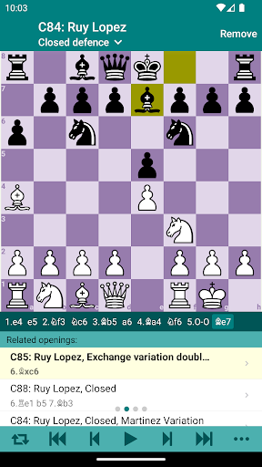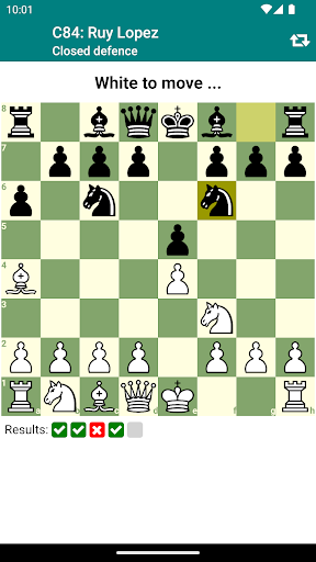 A simple and efficient method to memorize variations of openings in your repertoire. You can train either white’s moves or black’s moves only or both. Optionally, you can train all variations at once. The trainer chooses opponent’s moves randomly from your opening repertoire. Chess Opener tracks your progress and shows your stats.
