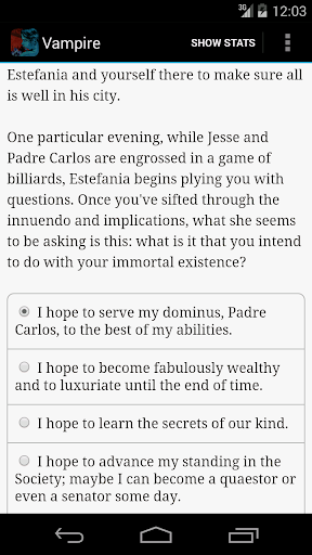 Choice of the Vampire is an epic, four-volume, 850,000-word interactive novel, by Jason Stevan Hill. It's entirely text-based, without graphics or sound effects, and fueled by the vast, unstoppable power of your imagination.