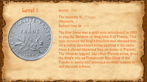 Coin collection Quiz is a game where you can test your knowledge of countries and coins. There are 60 levels with coins from different countries and your goal is to find out to which country does the coin belong.