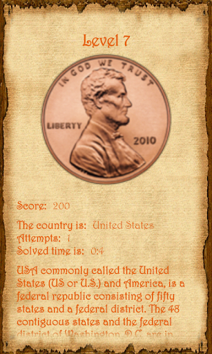 - 84 levels with coins from different countries (USA, UK, Germany, France, Italy, Spain, Taiwan, India, Thailand, Norway, Australia, South Africa, Canada, Malaysia, Saudi Arabia and many many more)