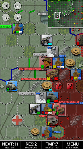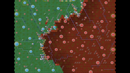 In order to be a victorious general, you must learn to coordinate your attacks in two ways. First, as adjacent units give support to an attacking unit, keep your units in groups in order to gain local superiority. Secondly, it is rarely the best idea to use brute force when it is possible to encircle the enemy and cut off its supply lines instead.