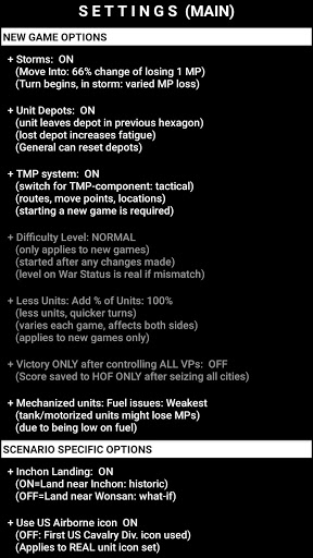 Settings: Various options are available to alter the look of the gaming experience: Change difficulty level, hexagon size, Animation speed, choose icon set for units (NATO or REAL) and cities (Round, Shield, Square, block of hourses), decide what is drawn on the map, and much more.
