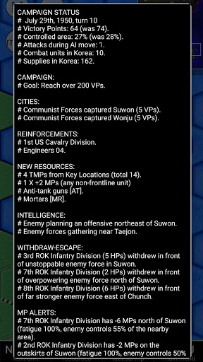 Korean War 1950-1953, also known as the Forgotten War, is a turn based strategy game set on the Korean Peninsula, depicting the struggle which grew from just including local North and South Korean troops to a massive multinational confrontation between American led UN troops and the northern Communist forces which included over million Chinese soldiers and material support from the Soviet Union. You are in command of the US led UN amphibious force tasked with stopping the initial North Korean offensive before they control the entire peninsula. The second part of your mission is securing the lasting peace on the area by conquering the entire land mass of Korea - and if the Chinese Red Army crosses the border to Korea you have the authorization to engage them to push communist forces out.