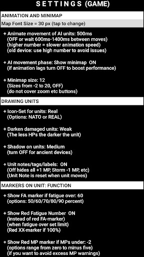 Settings: Various options are available to alter the look of the gaming experience: Change difficulty level, hexagon size, Animation speed, choose icon set for units (NATO or REAL) and cities (Round, Shield, Square, block of houses), decide what is drawn on the map, and much more.