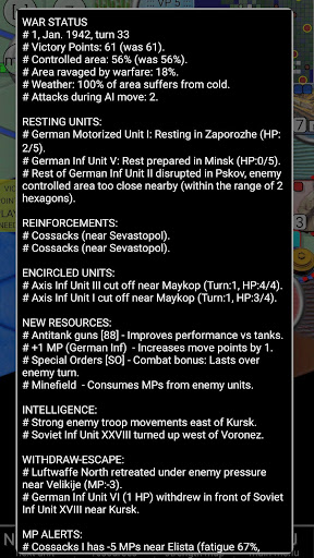 A large range of WWII units under your command: tanks, infantry, motorized infantry, weak Axis infantry, Waffen SS troops, the German air force and espionage units. Meanwhile, the Red Army starts with weaker infantry, cavalry and tank units, but as the weeks pass, is reinforced with stronger Siberian and T-34 tank units.