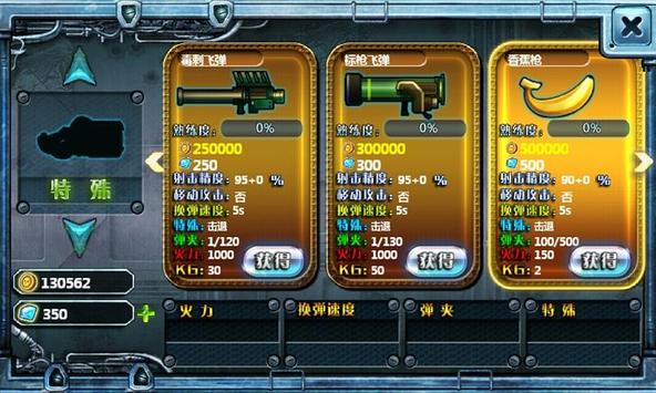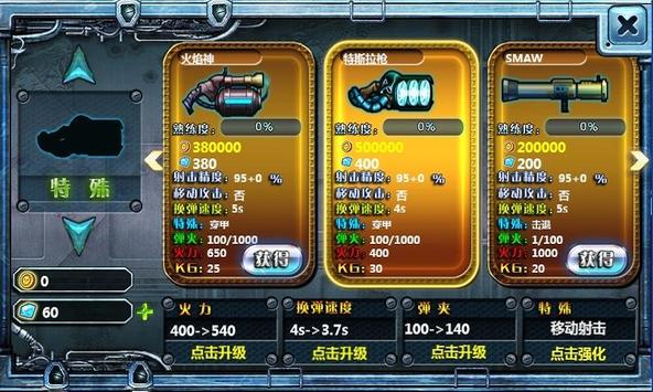■ arsenal: After the sale of all the weapons in the game, you can gradually strengthen arms purchases.