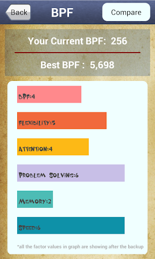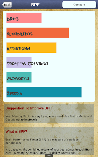 Brain power factor (BPF) to check overall improvement of your cognitive skills after you started playing game.