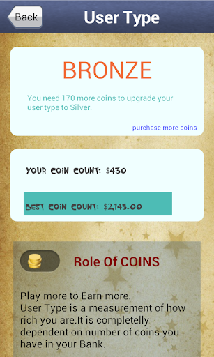 User type as Bronze, Silver, Gold, Platinum and Diamond to categorize you in different user areas.