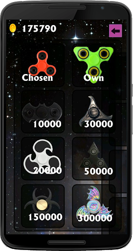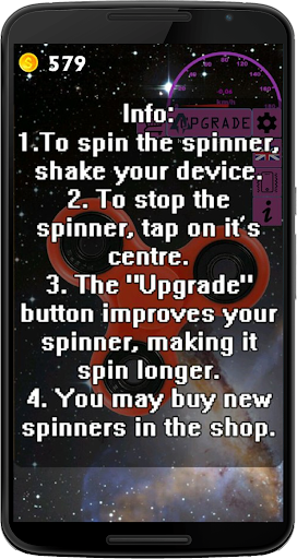 Info: 1. To spin the spinner, shake your device. 2. To stop the spinner, tap on it. 3. The "Upgrade" button improves your spinner, making it spin longer. 4. You may buy new spinners in the shop.