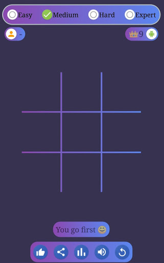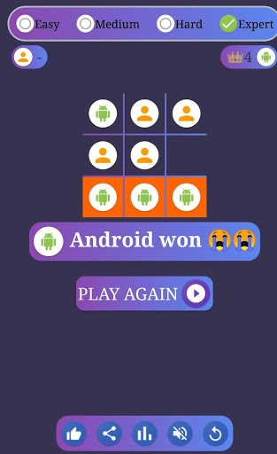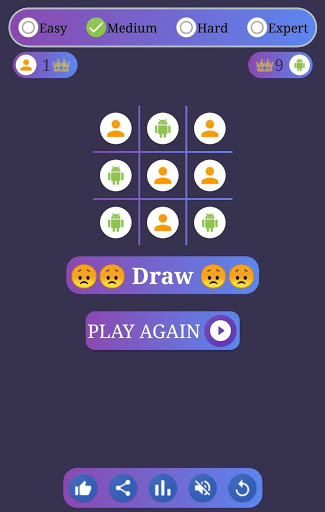 Tic-tac-toe or Xs and Os is a free digital version of a paper-and-pencil board game for two players, X and 0. In this game, a human player is represented by a Human Icon whereas the opponent AI-powered player is represented by Android Icon.