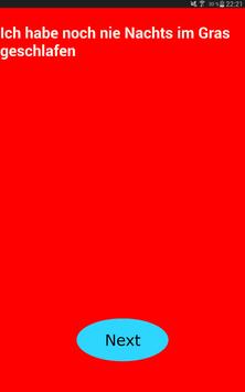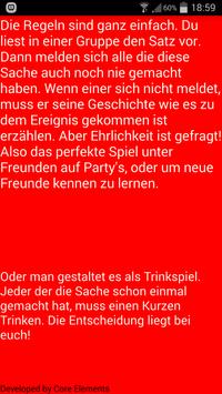 Man kann aber auch die alkoholfreie Variante spielen. Dann liest einfach jemand einen Satz vor und alle die diese Sache schon einmal gemacht haben müssen erzählen wann und wie.