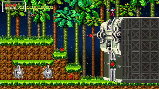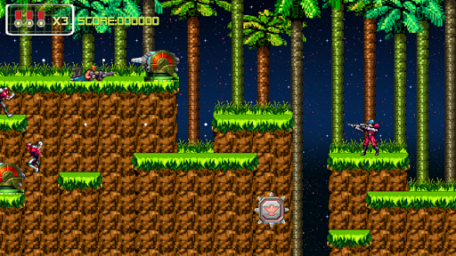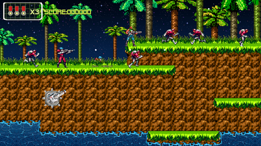 The first stage is a side-scrolling level where the player character is dropped into the jungle and must fend off the enemy's initial line of defense until he reaches the entrance of the first base, where he must destroy a large sensor to enter the base. The player loses a life if their character gets touched by an enemy or enemy bullet, fails to complete a base stage before the time limit, or falls into the bottom of the screen when there is no visible platform. When that happens, the character will revert to his default weapon on his next life.