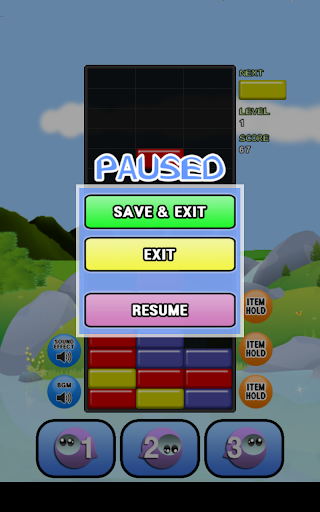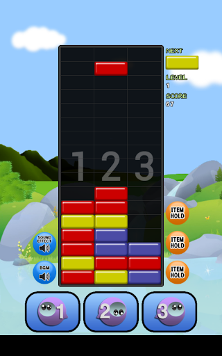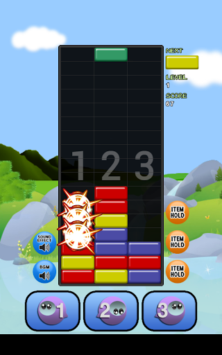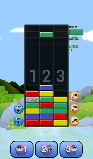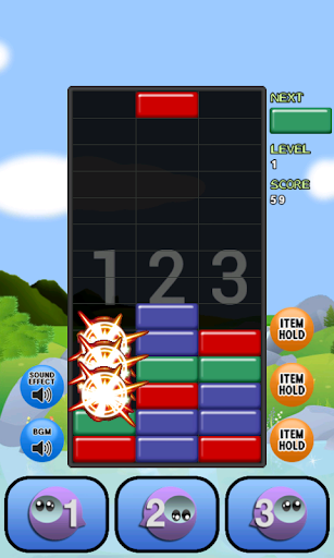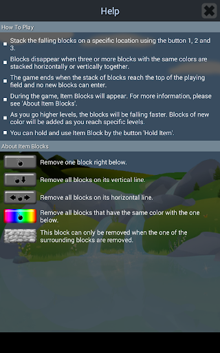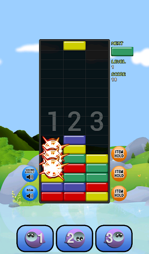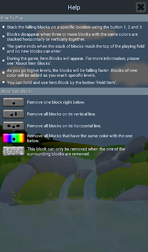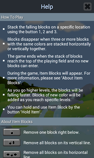 • Blocks disappear when three or more blocks with the same colors are stacked horizontally or vertically together.