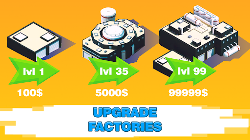 • Build factories, reinvest the money into upgrades and increase your per-minute profits.