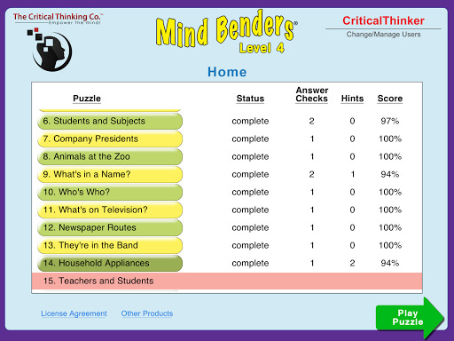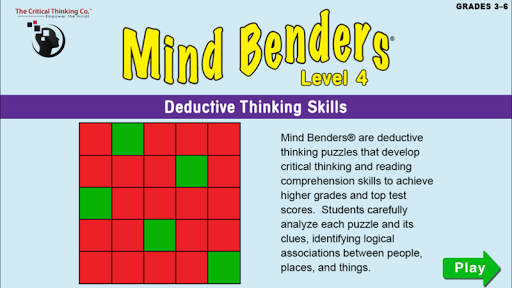 Mind Benders®, our best-selling deductive thinking puzzles, develop the logic, reading comprehension, and mental organization skills vital to achieving higher grades and top test scores in all subjects. They’re also great for developing real-life, problem solving skills.