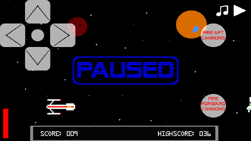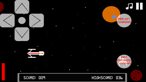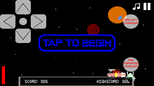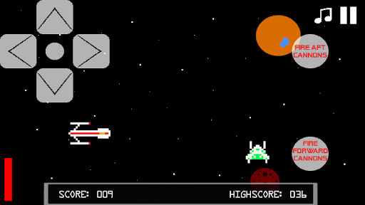 Instructions: Aliens enter the screen on the right. Destroy them with the fire buttons on the right before they reach the left side of the screen, or the game will end. To control your ship, tap the touchpad in the top-left, and drag around. The further from the center your finger is, the more quickly you will accelerate.