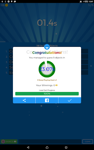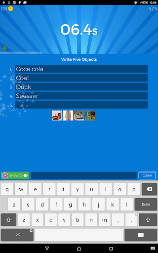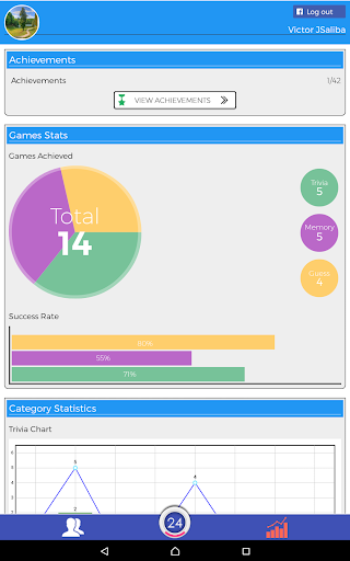 You can play 3 different kinds of game modes or quiz types (Trivia Quiz, Memory Challenge, Guess the Object) in each level. Your task is to complete at least one quiz type in less than 24 seconds in order to advance to next level. Each group of 4 levels require a number of objectives to be achieved in order to progress to the next 4 (Level Set)! As you go along you can check your statistics and compare your progress with your friends!