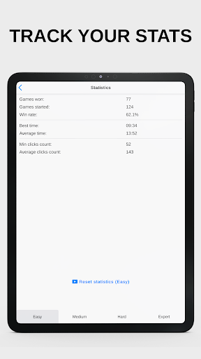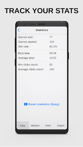• The game is recording statistics. Track your progress on each difficulty level: analyze the best time, win rate and other indicators.