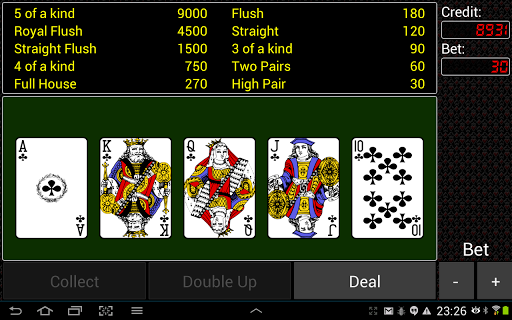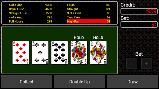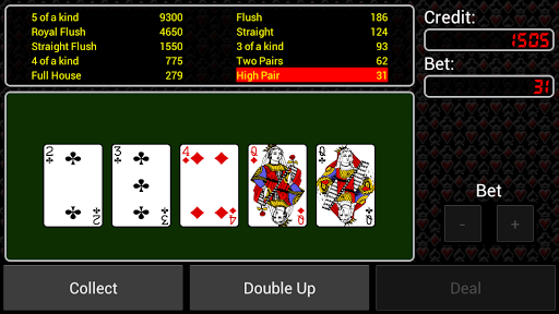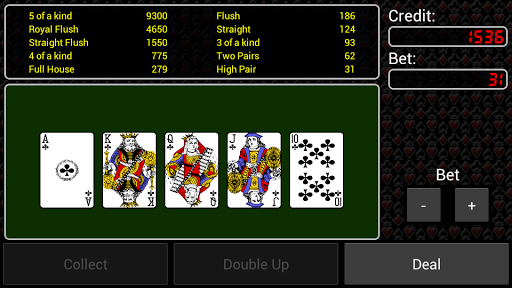 Start by adding some credits - press menu button and select "Add Credit". Then, select a bet from " " and "-" buttons. After you've chosen the desired bet, press "Deal" button to deal some cards. Select which cards you want to keep and press "Draw" button.