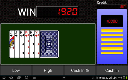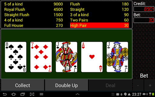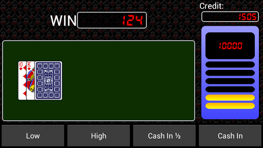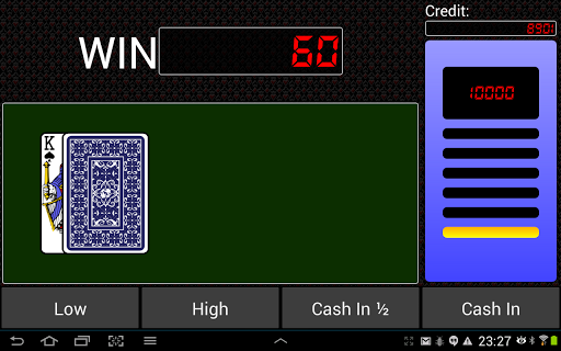This is a small, simple video poker, with a double up mini-game - you can double your winnings by trying to guess the correct card sequence from a randomly generated card deck. With each correct guess, the pot is doubled; do one mistake and you lose it ;). Of course, you don't have to tell the exact value of the cards, you just have to guess if it's a high card or a low card. This version is supported by ads and has a limit on the amount of credit which can be requested daily - 5000.