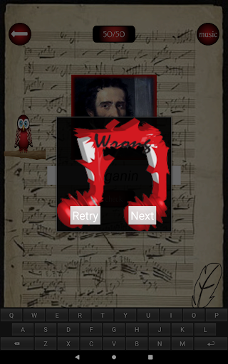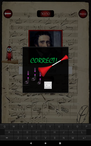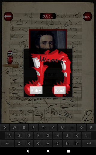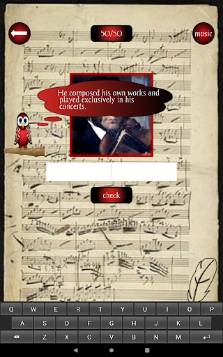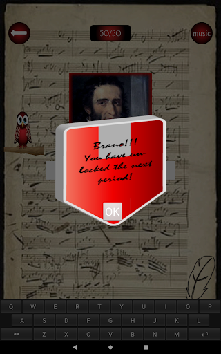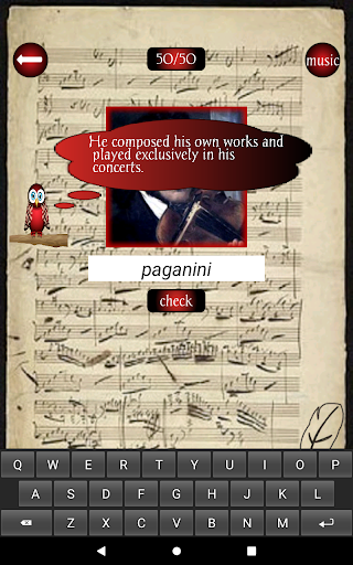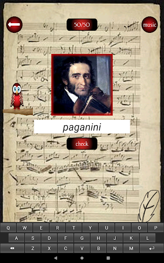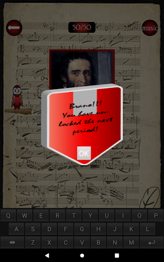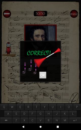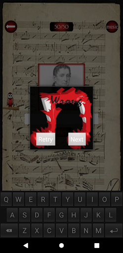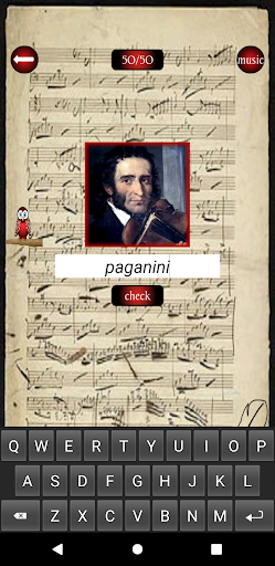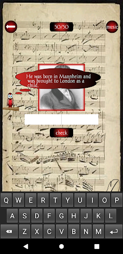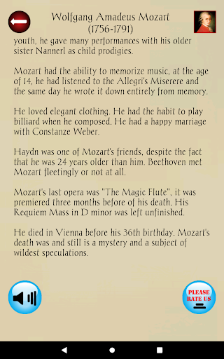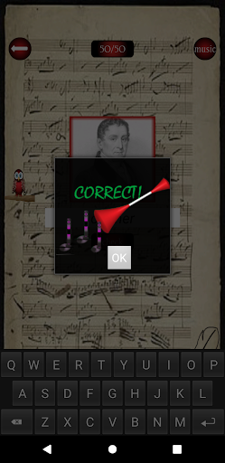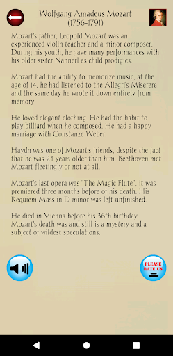 The rules of Composer Quiz: Find the composer's surname. Take a look at his photo, press the music button to listen seconds of his music tune in order to identify him. If you do not recognize him, try to find the next one. 42 composers are categorized in 4 periods (Baroque, Classical, Romantic, 20th Century). After each correct answer, you will be able to read a short biography and listen to the sample of the composer's musical piece as many times as you want. The app can be played offline, no internet connection is needed.
