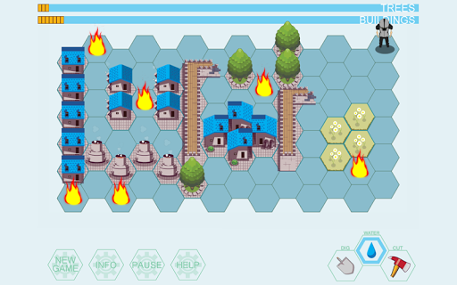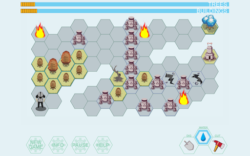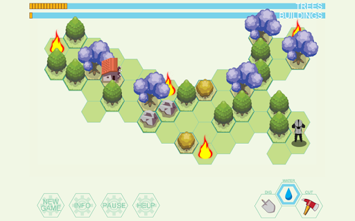 Deus Apparatus, an evil machine, has set fires to five regions. In this action packed game, it is your job as a fire fighter to extinguish all the fires. Put out fires before they destroy buildings and trees. These fires spread rapidly, but you can use your ax, water, and shovel to gain control of the fires.