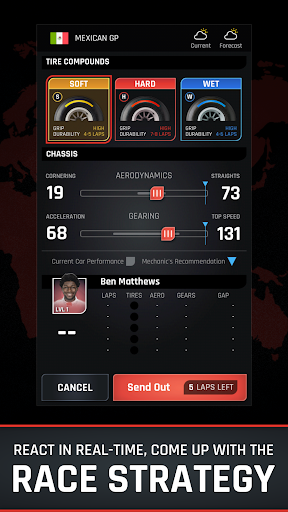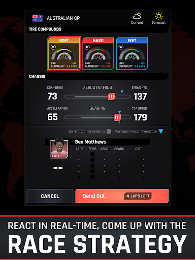 * Come up with the ideal pit stop strategy and react to weather changes, accidents and safety car periods