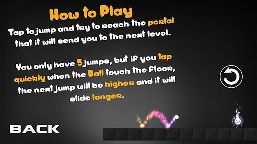 Gamma Ball is a very addictive strategy type game, in which your goal is to get your "gamma ball" into the portal that it will send you to the next level. The concept is simple but is really fun, you have to Tap the screen of your Phone or Tablet to jump, (you only have 5 jumps when level start) each time you tap the screen, once the ball hits the floor, the next jump will be higher, the quickly the best (sometimes).