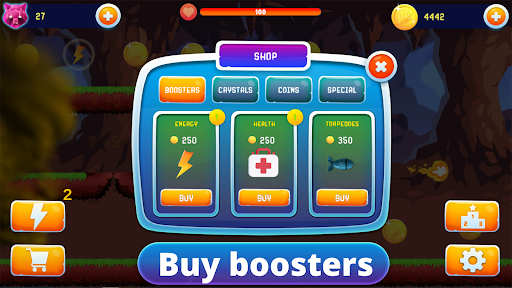 Boosters are available in the shop or collected throughout their run. You can choose between Energy, Health or Torpedes whatever you want.