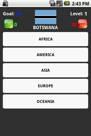 During the game the flag and the name of the country are displayed randomly. You have to choose one of five options continent, America, Asia, Africa, Europe and Oceania to hit. Will be counted wrongs.