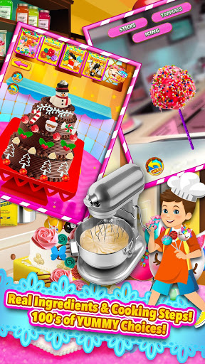 MAKE Cake Pops by choosing Flavor and Mix Ingredients. Select Toppings and Candy Decorations by touching screen and adding them to your Cake Pop!