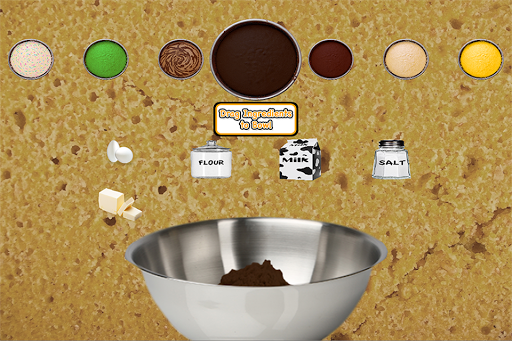 Select cake flavor. Mix ingredients. Bake cake batter. Select cake shape. Begin decorating cake and select background. Finish by eating cake and save to photo gallery.