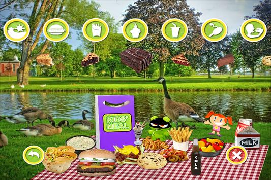 Choose from over 90 items including Burgers, Chicken Nuggets, Hot Dogs, Curly Fries, Chocolate, Sundaes, Cookies, Cupcakes, Donuts, Cake Pops, Apple Slices, Churros, Soda, Candy, Desserts, and Toys galore! Enjoy 5 different backgrounds- Amusement Park, Water Park, Beach, Playground, and Park with Ducks!