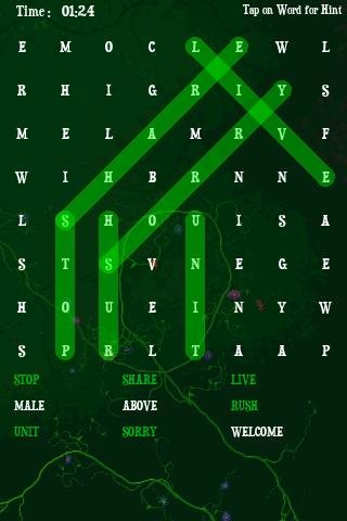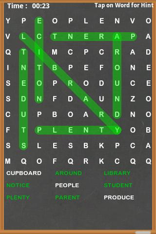 Fun is achieved by searching words lost in the jungle of alphabets placed on the game board. Words are placed horizontally, vertically and diagonally on the game board. Move your figure across the alphabet to mark a word you are searching for. Hints are provided by tapping on the word, which get highlighted to show correct word on the board.