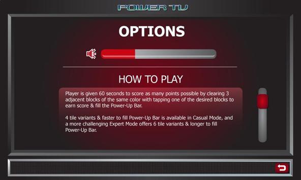 Player is given 60 seconds to score as many points possible by clearing 3 adjacent blocks of the same color with tapping one of the desired blocks to earn score & fill the Power-Up Bar.