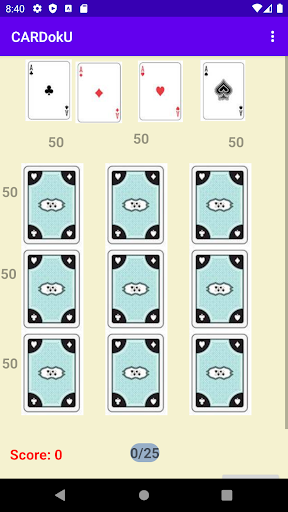 The CARDokU game gives you a 3 x 3 matrix of cards drawn randomly from a deck. In every attempt, you can either guess the suit of the card, or you can guess the sum total of a row or column. If you guess the suit correctly, the card will be revealed. If you guess the sum total of a row or column correctly you will gain some score. The game will be over in 25 steps, so try to gain as many points as possible before it's over.