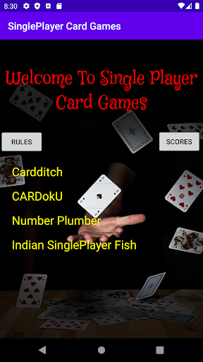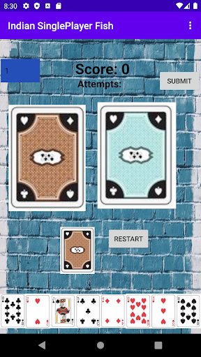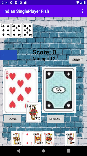 The SinglePlayerFish is an Indian variant of rummy, with a introduction of a little twist. You will be given 8 cards, and will aim to empty your hand as soon as possible. There will be a trump card, which can be used as any card, and it will be revealed only after you submit a set to the deck.