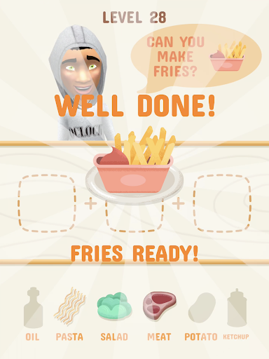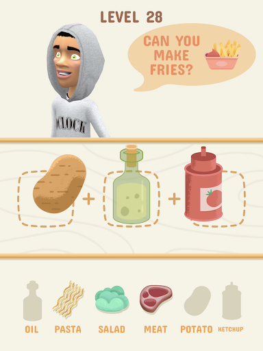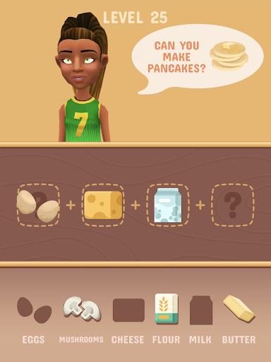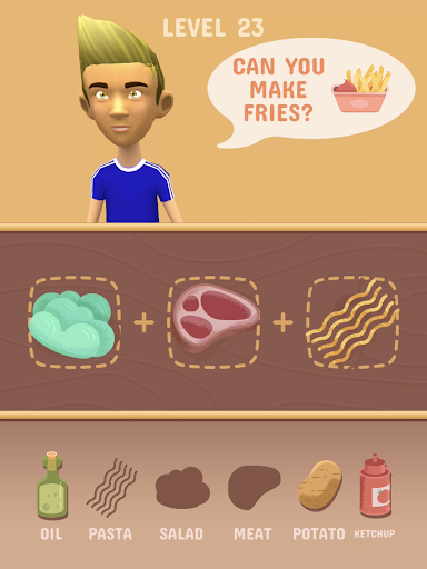 Find the proper ingredients, merge them to cook various, delicious dishes like fries, burger, pizza or pancakes. Delicious apple pie or ice cream! Have fun guessing the recipes.