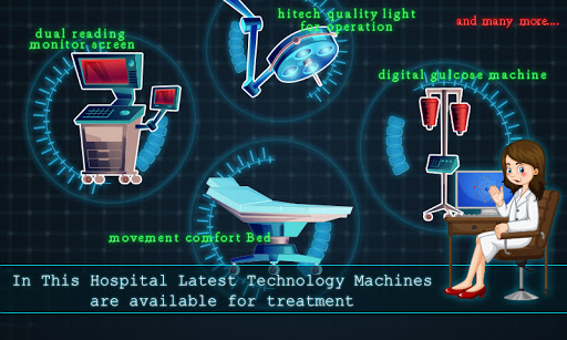 Doctor Game :Surgery Hospital : Educational and Doctor game based on Hospital and medical scenario. Just Plan, manage time to perform operation in this game .The user can help patient's to get relief from pain and injury and also ensures their speedy recovery. Doctor Game :Surgery Hospital provides an experience of operating a hospital which have all the facilities including emergency ward, ambulance, ventilation etc. This game give you chance to become a real experience of doctor and now its time to heal your patients in your own game. In this Doctor Game :Surgery Hospital you have to manage your patients with different disease. Also this Hospital Game is called a Perfect Hospital Game to execute your dreams. The business segment of the hospital is in dentist, surgeon, cardiologist, lab etc. Apart from hospital, the user can also maintain the cash balance, manage clinic, assign nurses to patients and other maintenance to the hospital.