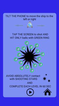 very simply must hit [just touch the screen to shoot] spheres surrounded by a green ring while the black star turns with increasing speed and changing direction suddenly. Tilt the smartphone to move right / left the ship and avoid collision with shooting stars.